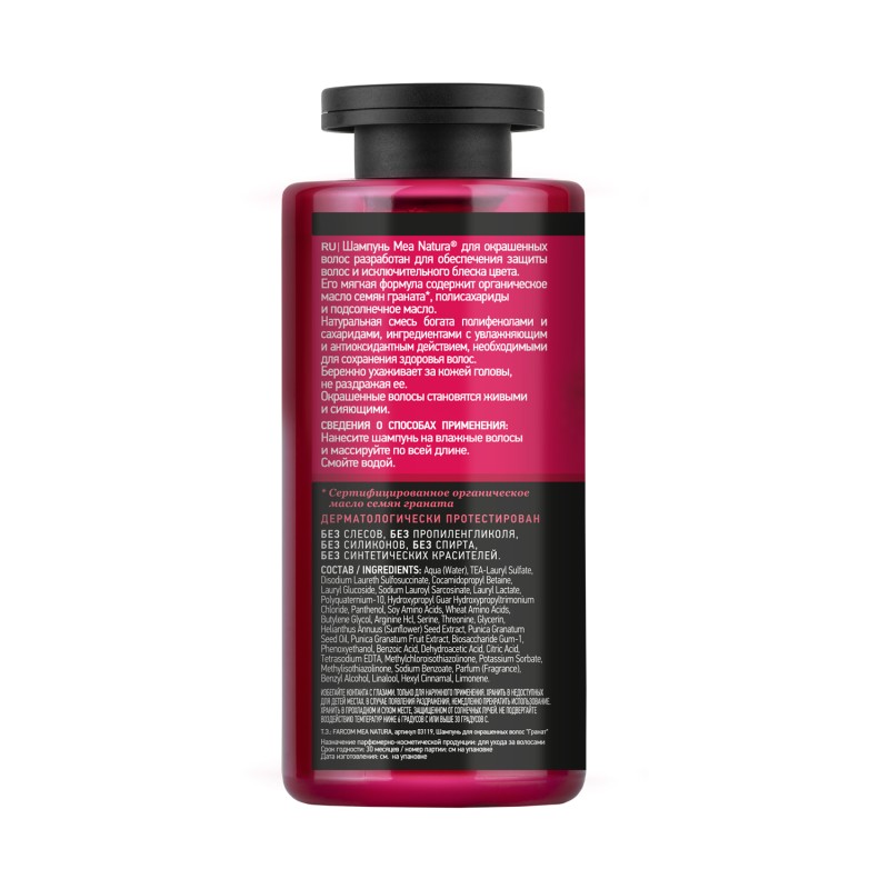 Очищающий шампунь с органическим маслом косточек граната*, полисахаридами и подсолнечным маслом — натуральным комплексом, обогащенным полифенолами, танинами и витаминами, увлажняющими компонентами и антиоксидантами, необходимыми для ухода за окрашенными волосами.